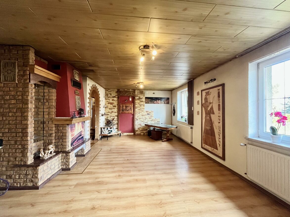Z jednej z sypialni znajduje się wyjście na wykostkowany taras z pięknym widokiem na pola i lasy. To idealne miejsce na odpoczynek w ciszy, z możliwością obserwacji saren i innych leśnych zwierząt.